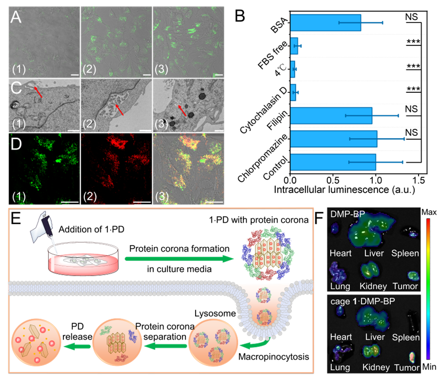 本研究进一步探究了蛋白对cage 1递送PD的作用。首先,共聚焦成像(CLSM)分析显示,复合物的细胞摄取高度依赖血清蛋白(图4A, 4B):在含胎牛血清(FBS)或BSA的培养基中,胞内荧光强度显著提升,而无蛋白条件下PDs的内化效率显著降低,表明蛋白冠通过疏水屏蔽作用维持PDs与cage 1的结合稳定性。动态光散射(DLS)研究表明,cage 1žPD复合物在含血清环境中形成~200 nm纳米聚集体(适配大胞饮途径);而无血清条件下因缺乏蛋白冠保护导致聚集体尺寸增至~4.2 µm。荧光共振能量转移(FRET)分析进一步证实cage 1可介导血清白蛋白(BSA)与PDs形成稳定三元复合物,而游离PDs无此结合特性。最后,本研究深入探究了配合物的细胞内化机制。通过配合物内吞抑制实验结合透射电镜(TEM)(图4C)观察到的特征性细胞膜内陷及直径>500 nm的囊泡结构,确认大胞饮作用为其主要摄取途径。PDs与溶酶体共定位实验进一步揭示配合物经大胞饮内吞后靶向溶酶体/内体区室(图4D),PDs的释放过程与蛋白质冠解离及溶酶体酸化微环境存在协同作用(图4E)。体内分布实验证实cage 1žPD配合物通过增强渗透与滞留(EPR)效应实现肿瘤组织特异性积累,其肿瘤区域荧光强度较游离药物提升(图4F)。这种具有肿瘤选择性的递送方式可实现磷/膦酸盐类治疗药物(包括核苷酸类似物和寡聚核酸药物)的精确靶向,从而有效抑制肿瘤和进行联合治疗,推动精准肿瘤学的前沿发展。