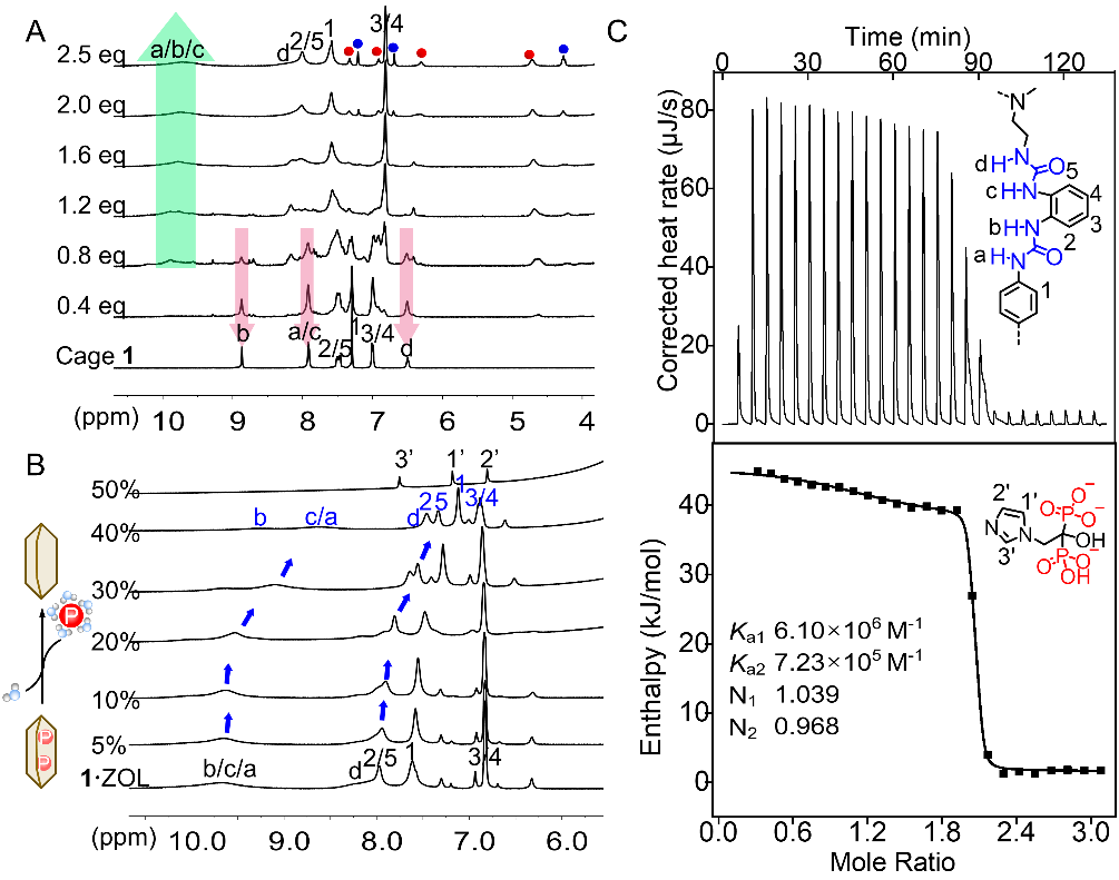以硫酸根离子为模板,三足三脲前体与1,4-亚苯基二异氰酸酯通过一锅法反应合成十二脲分子笼(cage 1)。单晶分析表明,cage 1与不同PDs以1:2结合(图1B),每个阴离子通过多重氢键稳定结合于六脲单元内。笼状结构的轴向高度及中间苯环形成的空腔可动态调整以适配不同尺寸阴离子。核磁共振(NMR)滴定分析显示(图2A),连续滴定PDs导致cage 1的NH质子产生显著低场位移,伴随复合物特征峰的出现,证明PDs与cage 1在NMR时间尺度下存在慢交换热力学结合机制。溶剂极性效应实验证实,水含量的梯度增加(从0.5%增加至20%(H2O/DMSO-d6))显著削弱配合物主客体间的氢键相互作用(图2B),导致cage 1与PDs的结合常数呈现数量级递减:从106 M−1降至104 M−1。由此推演,纯水溶液中cage 1与PDs的结合常数将显著降低(<<10<>4 M−1),再次验证cage 1在水环境中能够高效释放PDs。等温滴定量热法(ITC)测得的复合物1⋅PD的结合常数Ka1为106~ 107 M−1(图2C),与磷酸盐转运蛋白(Ka = 106 M−1)相当,且不同PD底物间的结合常数差异极小,同样表明cage 1具有自适应阴离子结合特性。
