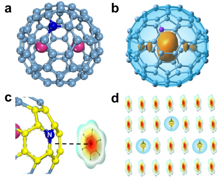 图1. Y2@C79N的结构及自旋感知芳香族化合物取向示意图。