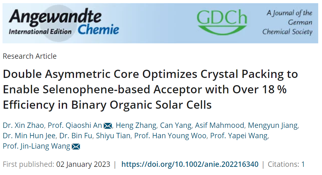 近期,小说网 王金亮教授团队在集成外侧烷基不对称异构化和单硒取代策略的硒吩类小分子受体材料创制及其在高性能有机太阳能电池的应用研究方面取得重要进展,相关研究成果发表在国际化学领域顶级期刊《Angewandte Chemie International Edition》(DOI: 10.1002/anie.202216340)上,题为“Double Asymmetric Core Optimizes Crystal Packing to Enable Selenophene-based Acceptor with Over 18 % Efficiency in Binary Organic Solar Cells”。 小说网 为唯一通讯单位,小说网 王金亮教授和安桥石特别研究员为共同通讯作者,硕士研究生赵鑫和安桥石特别研究员为该论文的共同第一作者。