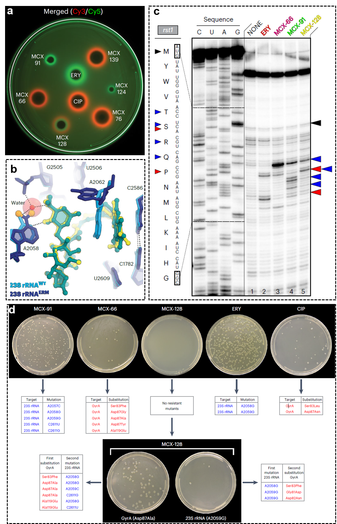 近十余年来,梁建华团队在抗耐药菌大环内酯上不断迭代设计,从数百种抗耐药菌大环内酯中挑选了3种代表性的“macrolone”结构,与Yury S. Polikanov副教授和Alexander S. Mankin教授合作进行了机制研究。通过体内双基因报告(图a)和体外蛋白翻译转录抑制实验以及DNA超螺旋抑制实验确定三种结构的主要作用靶标是不同的,分别是MCX-91主要作用于核糖体、MCX-66主要作用于DNA促旋酶、MCX-128能够同时作用于核糖体以及DNA促旋酶。模式菌Thermus thermophilus核糖体与这三个化合物的高分辨率复合物晶体结构(分辨率是2.35Å-2.60Å)显示作用于核糖体的C2586-C1782新位点(图b),这与我们先前临床病原菌金黄色葡萄球菌(MRSA)核糖体与化合物MCX-190的复合物冷冻电镜结构解析结果一致(Cell Discovery, 2024, 10(75),DOI : 10.1038/s41421-024-00702-y)。两种不同的核糖体结构解析技术相互印证了我们的化合物在不同菌株中均能作用于新位点C2586-C1782;并且MCX-128对于A2058双甲基化的模式菌核糖体也能够紧密结合,证明了其较好的抗耐药菌的新模式。而后我们又对化合物的抑制蛋白质翻译特征以及是否诱导细菌产生耐药特性进行了研究,通过toeprinting技术对化合物抑制蛋白翻译的停止位点研究发现,传统红霉素允许翻译的肽链长度较长,而MCX系列化合物在翻译较短肽链时即可停止(图c);红霉素会诱导erm耐药基因表达,但MCX系列化合物则不会诱导耐药基因表达,因此MCX系列化合物具有不同于以往大环内酯的新作用模式。特别需要指出的是,化合物MCX-128具有双靶标作用机制,药物在使用过程中当单一靶标突变时,化合物MCX-128作用另一靶标则能够有效地抑制单靶标突变的菌株,使其无法幸存下来,因此在MCX-128对抗下细菌很难同时在核糖体以及DNA促旋酶同时发生自发突变(图d),而相比之下单作用机制的化合物MCX-66和MCX-91较容易产生突变菌株。这样既不容易诱导耐药基因表达,又不容易使细菌产生自发突变的药物在临床使用具有很大的优势。