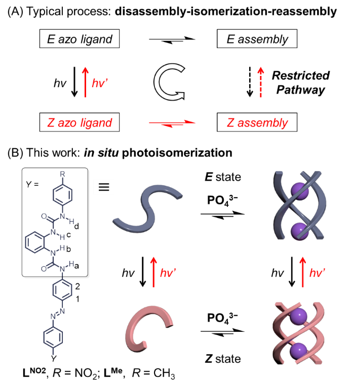 吴彪教授研究团队一直致力于阴离子配位作用相关的基础理论和前沿应用交叉研究,发展了“阴离子配位诱导组装”的新策略,实现了一系列超分子组装结构的精准调控 (Acc. Chem. Res. 2022, 55, 3218-3229)。研究发现,得益于阴离子配位作用的预组织多重氢键网络结构,形成的组装体具有强的结构灵活性和自适应性,能够发生类似于“弹簧”变化的分子运动 (Angew. Chem. Int. Ed. 2021, 60, 9389-9394)。近期,利用偶氮苯骨架的多脲配体与磷酸根离子的配位作用,偶氮苯的顺-反异构化行为能够控制组装结构(四面体笼和三股螺旋体)的可逆变化。在此基础上,为了厘清组装结构对偶氮苯光异构化行为的影响,他们系统研究了三股螺旋体的光异构过程。实验结果表明:偶氮苯光异构化过程中,三股螺旋体发生了“原位”光异构化现象(如图1B所示);这与普遍认知的“解离-光异构化-重组”过程明显不同。