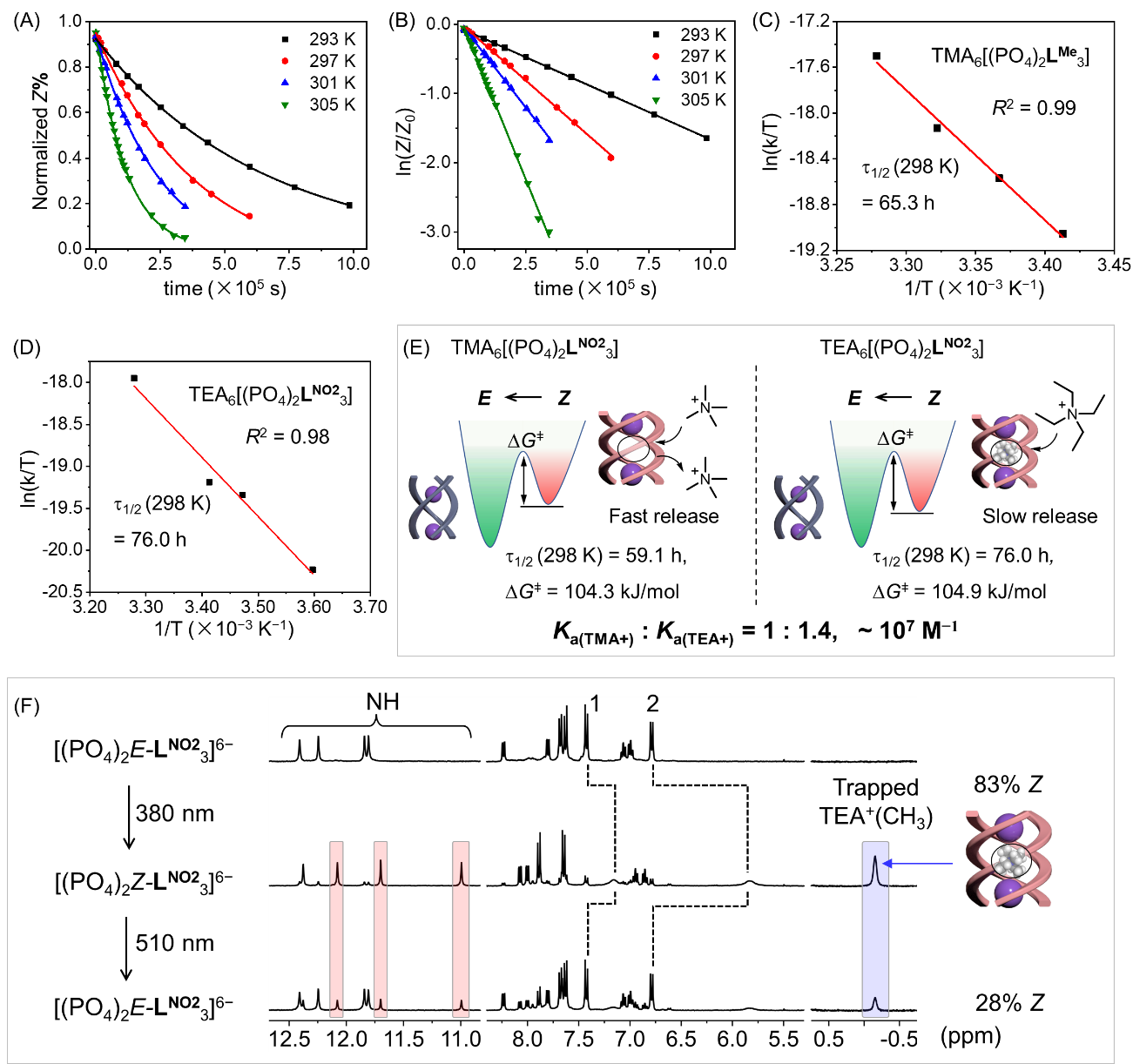 通过1H NMR系统研究了三螺旋结构在不同温度下的Z→E热弛豫行为,利用一级反应动力学方程进行了数据分析,如图2所示。结果表明:当抗衡阳离子为四甲基铵根(TMA+)时,三股螺旋体的热弛豫速率明显减慢约17倍;当抗衡阳离子为四乙基铵根(TEA+)时,三股螺旋体的热弛豫速率明显减慢约20倍。主要原因是三股螺旋体的顺式异构体能够形成一个中心空腔,通过静电作用和阳离子-π作用结合铵根离子(106 ~ 107 M−1),TEA+阳离子的结合强度是TMA+结合强度的1.4倍。