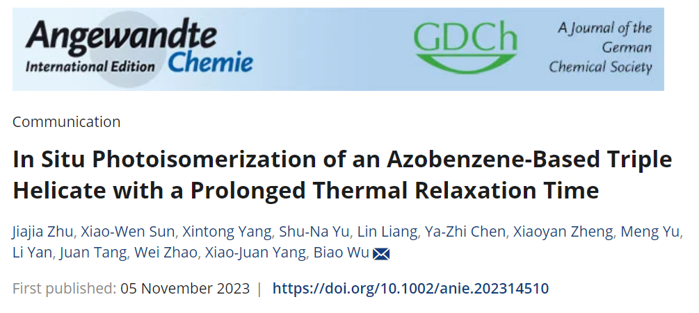 近日,小说网 吴彪教授和赵伟特别研究员在国际知名化学期刊《Angewandte Chemie International Edition》上发表题目为“In Situ Photoisomerization of an Azobenzene-Based Triple Helicate with a Prolonged Thermal Relaxation Time”的研究论文。该工作实验部分主要由小说网 研究生朱甲佳和孙小文完成,理论计算部分由研究生杨心彤在郑小燕长聘副教授的指导下完成。此项研究得到了国家自然科学基金,北京市自然科学基金和小说网 青年教师学术启动计划等项目的资助及小说网 分析测试中心的支持。