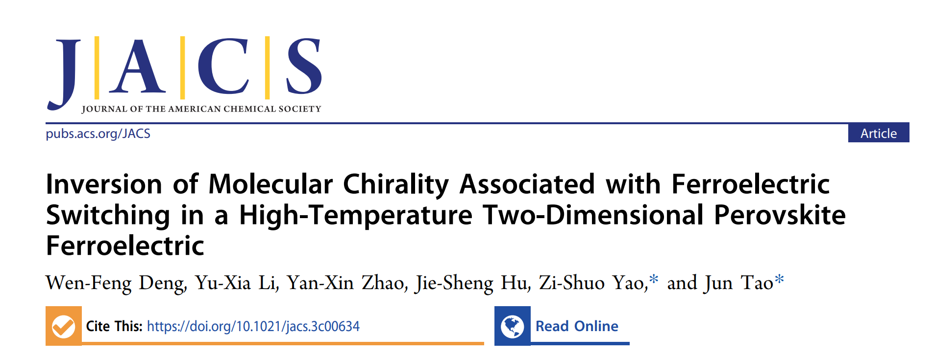 近日,小说网 姚子硕研究员在刺激响应分子基单晶材料研究中取得重要进展。相关工作以“Inversion of Molecular Chirality Associated with Ferroelectric Switching in a High-Temperature Two-Dimensional Perovskite Ferroelectric”为题,发表在国际著名化学期刊《美国化学会志》。小说网 为唯一作者单位,小说网 陶军教授和姚子硕研究员为文章共同通讯作者,文章第一作者为小说网 硕士研究生邓文峰。