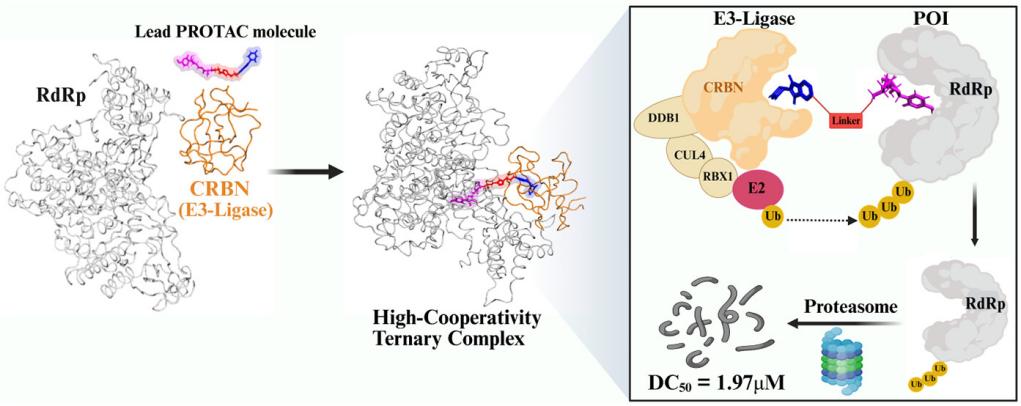 针对这一难题,团队提出结构引导的PROTAC设计策略,将临床验证的RdRp抑制剂(莫诺拉韦、瑞德西韦等)与E3泛素连接酶配体通过点击化学技术进行精准偶联。团队通过整合分子模拟、合成化学与生物验证等多学科手段,从600个候选分子中筛选出最优化合物PROTAC 10。该分子以莫诺拉韦为靶向弹头、CRBN为E3连接酶配体,通过三唑-烷基杂化连接子构建,展现出优异的靶向降解性能。