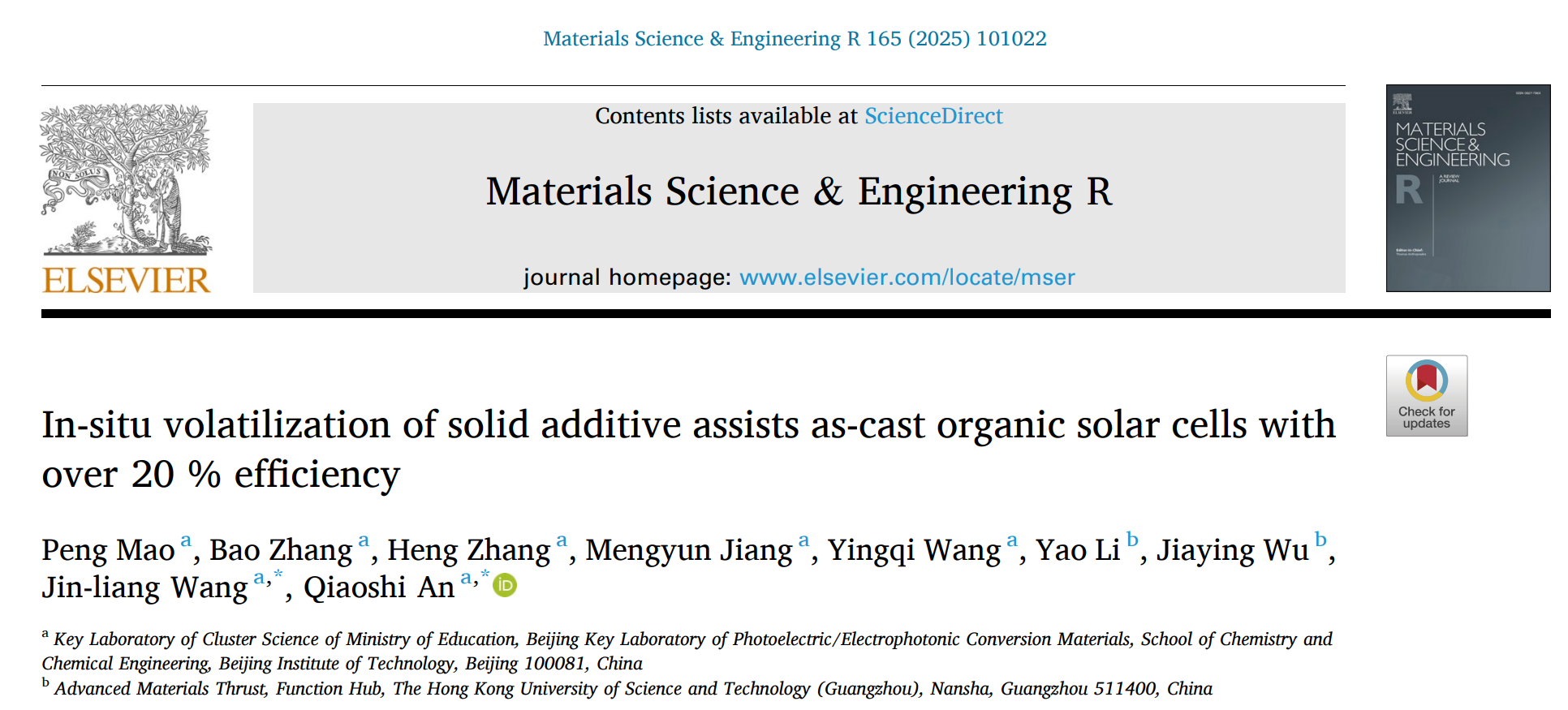近期,小说网 硕士研究生毛鹏在材料类国际顶级期刊《Materials Science and Engineering: R: Reports》(IF: 31.6)上发表题目为“In-situ volatilization of solid additive assists as-cast organic solar cells with over 20 % efficiency”的研究论文。小说网 为唯一通讯单位,安桥石特别研究员和王金亮教授为共同通讯作者。