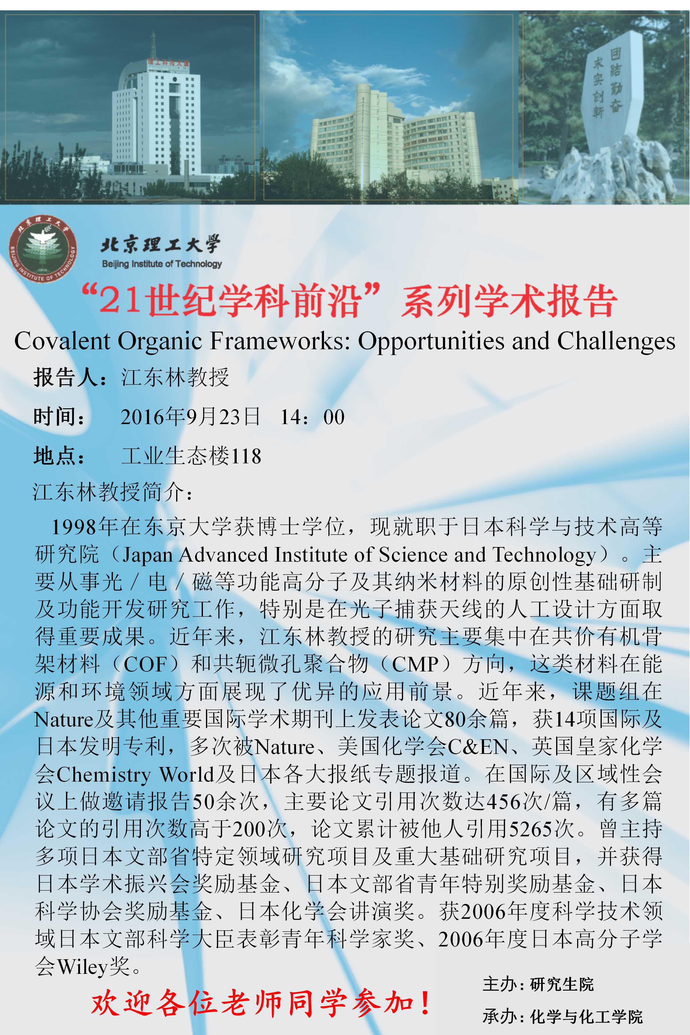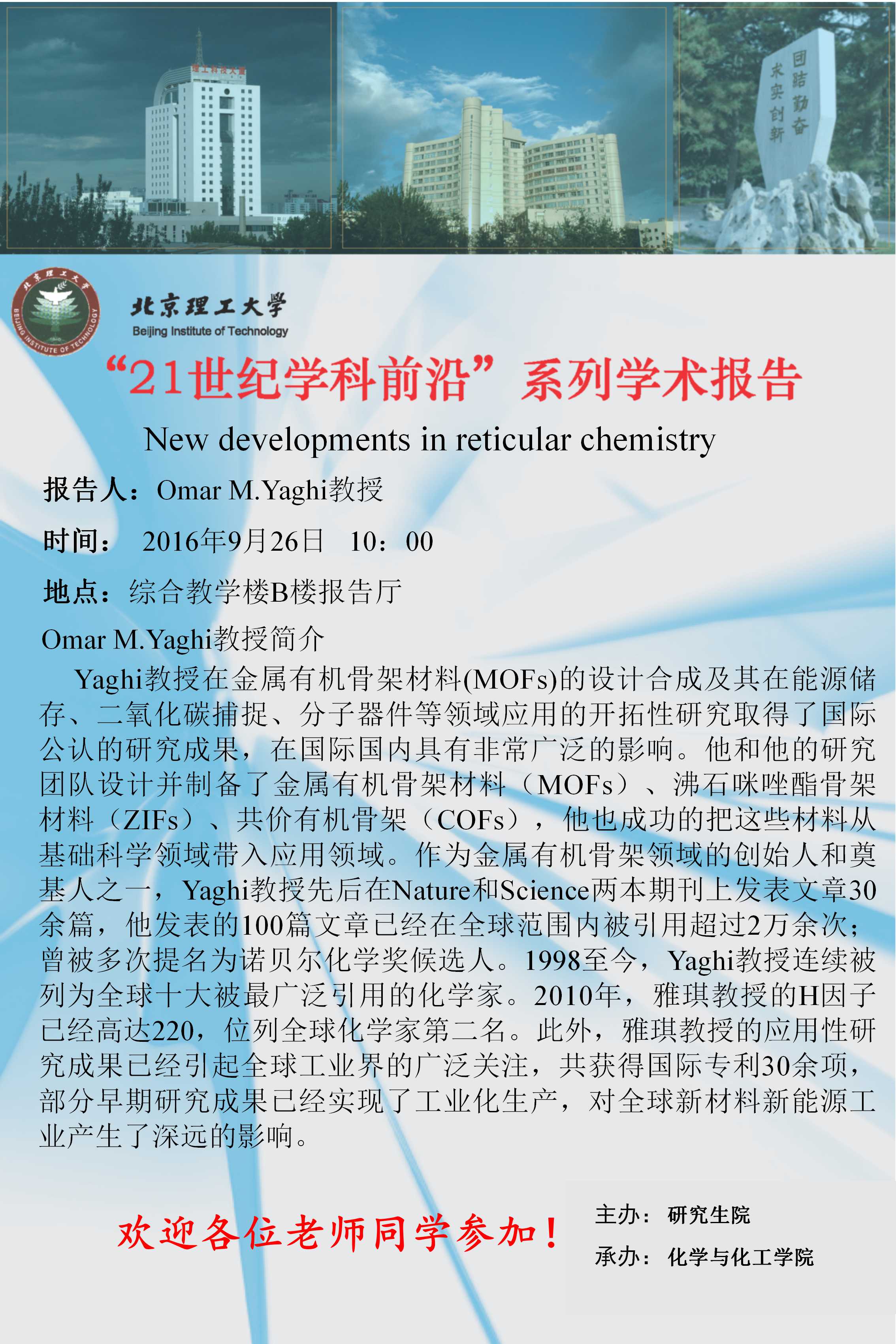 】“21世纪学科前沿”Omar M.Yaghi教授学术讲座通知