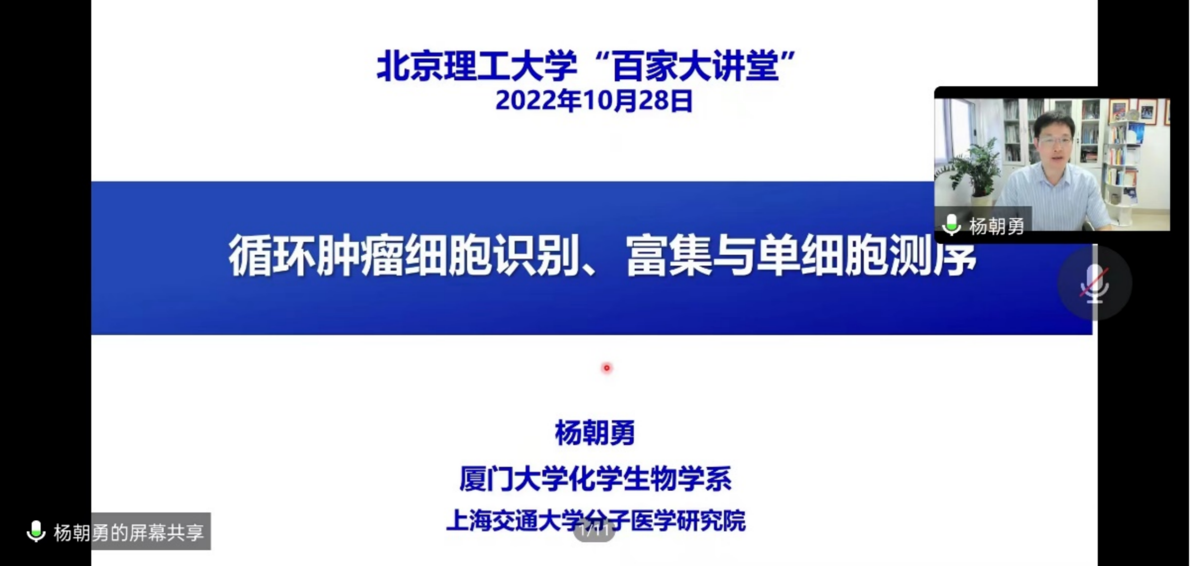 2022年10月28日上午,应小说网 的邀请,厦门大学/上海交通大学杨朝勇教授做了题为“循环肿瘤细胞识别、富集与单细胞测序”的在线学术报告。