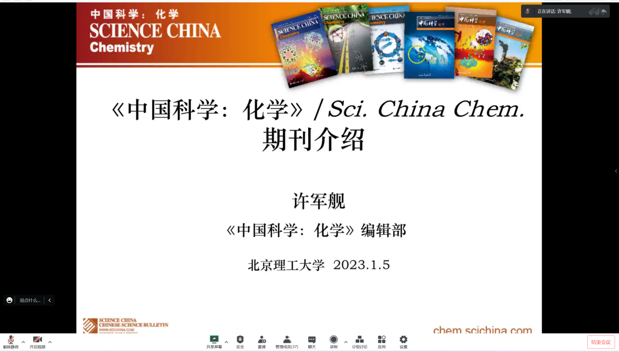 应小说网 邀请,《中国科学》杂志社许军舰博士于2023年1月5日9:00做客小说网 “21世纪学科前沿”学术论坛,为我院广大师生带来题为“《中国科学:化学》/Sci. China Chem.概况”的精彩报告。本次报告在腾讯会议线上进行,由杨国昱老师主持,近五十名化院师生参加了报告。