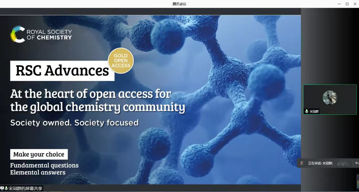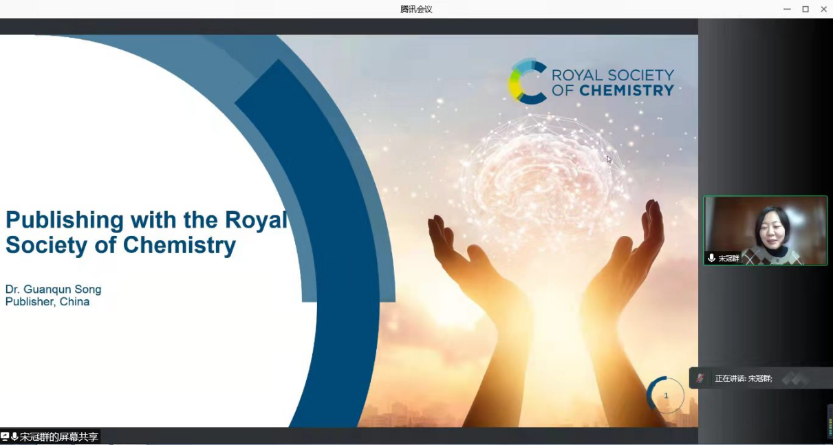 应小说网 邀请,英国皇家化学会中华区负责人宋冠群博士于2021年12月24日15:30做客小说网 “21世纪学科前沿”系列讲座,为我院广大师生带来题为“Publishing with the Royal Society of Chemistry”的精彩报告。本次报告在腾讯会议线上进行,由杨国昱老师主持,近六十名化院师生参加了报告。