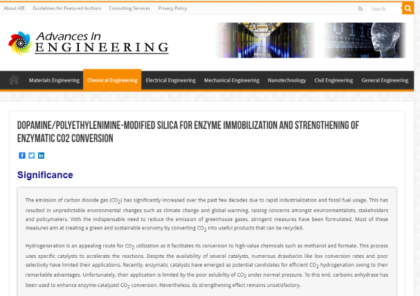 Advances in Engineering(AIE)于2005年在加拿大成立,其主要目的是及时快速地报道工程领域的重要科学研究成果和创新技术,被AIE报道的论文需要具有特殊的科学重要性并能够被广大的科学读者所理解。AIE报道链接://advanceseng.com/dopamine-polyethylenimine-modified-silica-enzyme-immobilization-strengthening-enzymatic-co2-conversion/